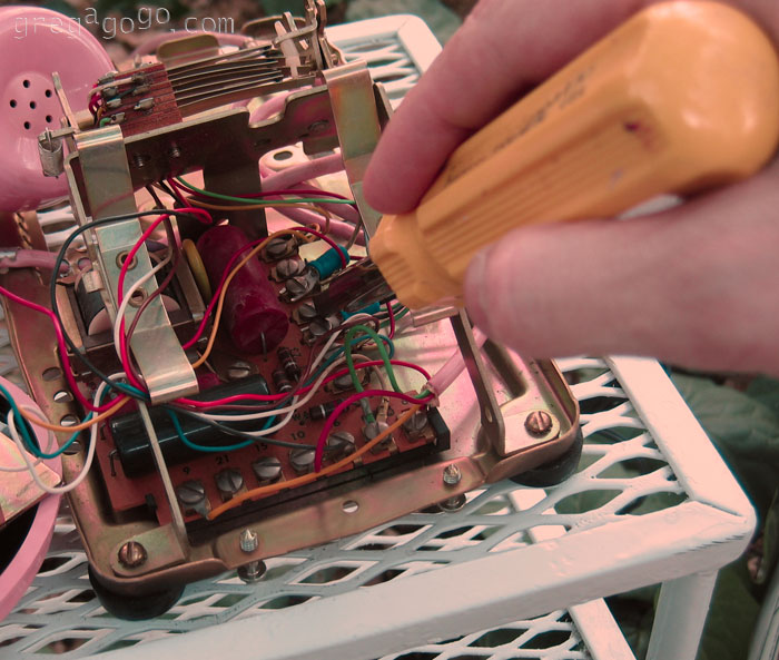 3c. Take the cover off the phone and look for the main terminal strip. It’s under the handset cradle. I’m pointing to it with my favorite yellow screwdriver. See?